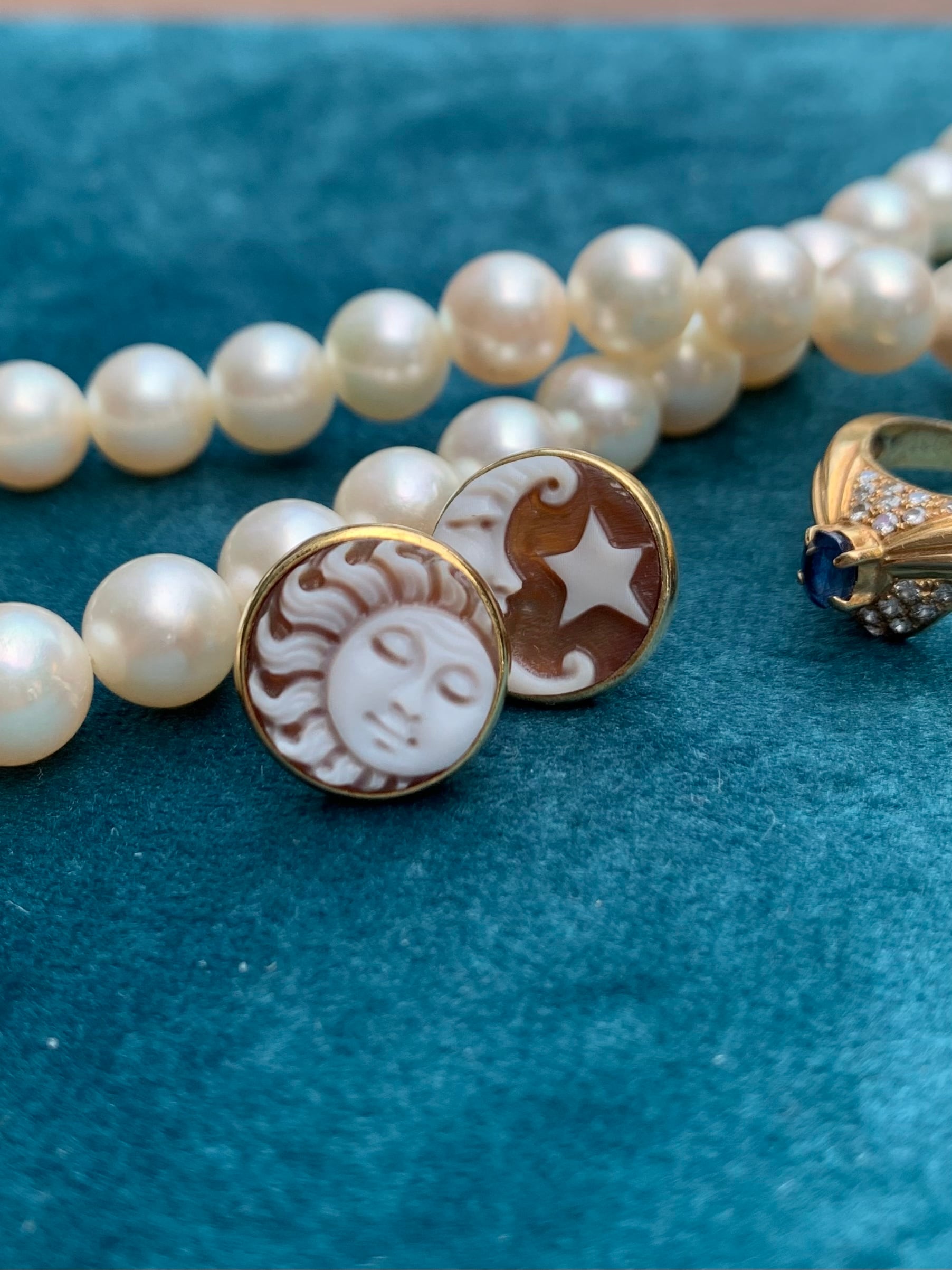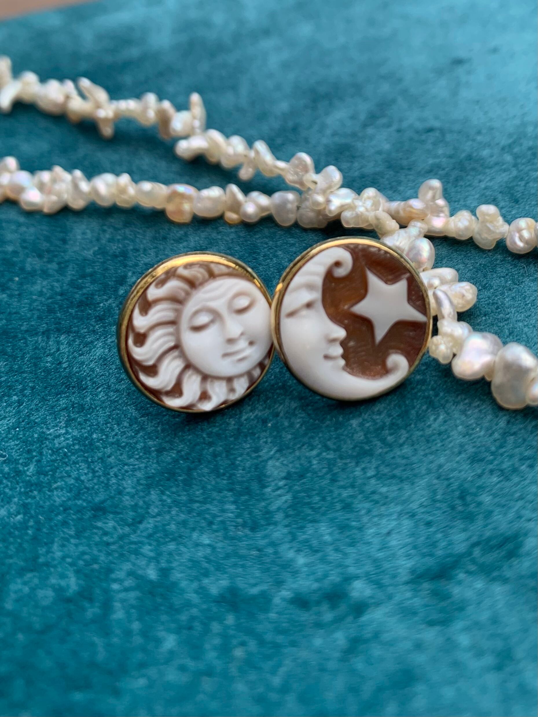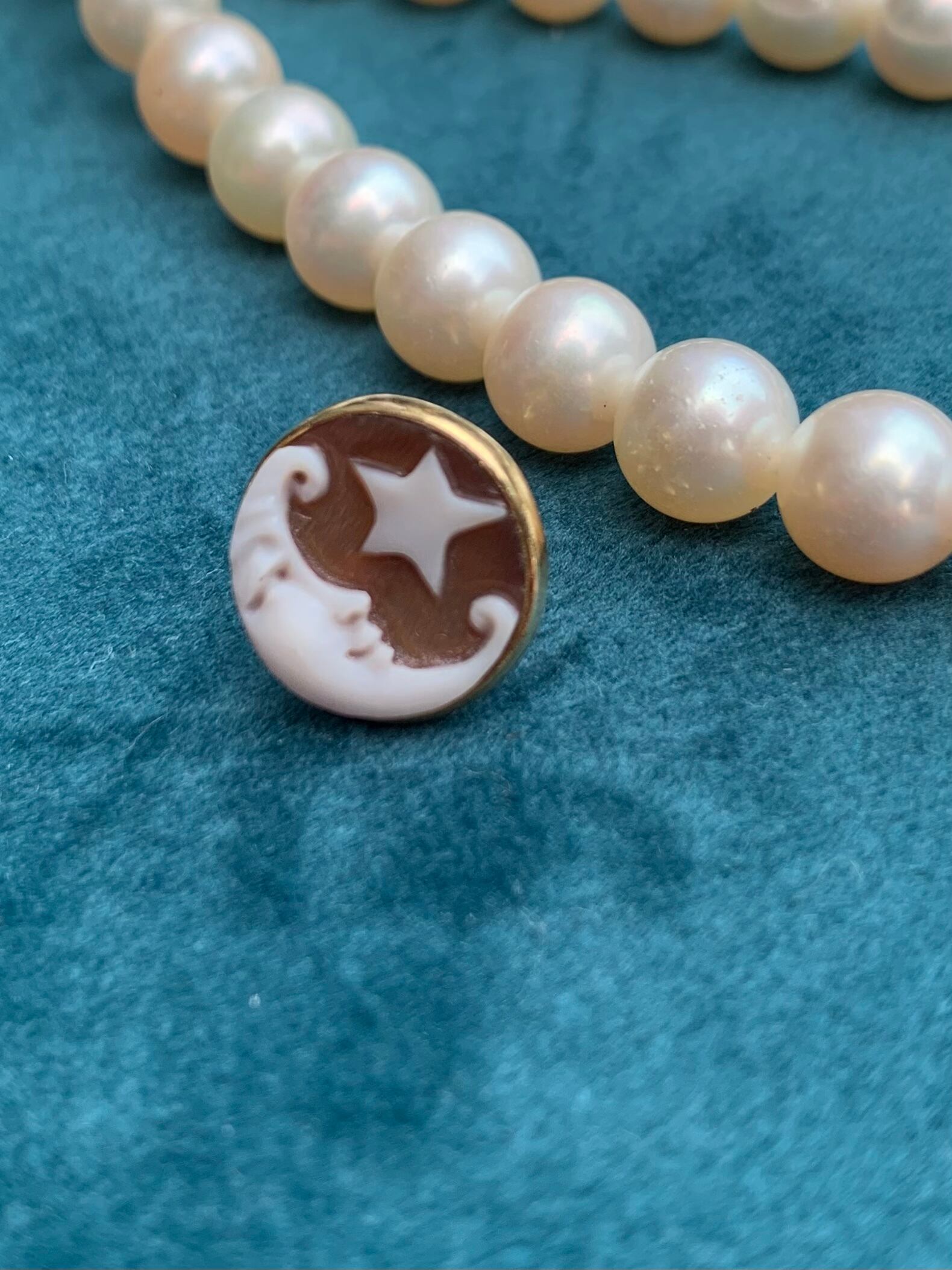 女性の横顔やお花のモチーフが多いカメオですが、こちらは珍しい天体モチーフです。落ち着いた雰囲気と上品な色合いが、あらゆるコーディネートに華やかさを添えます。さり気なく個性を演出するために、ぜひお試しください。