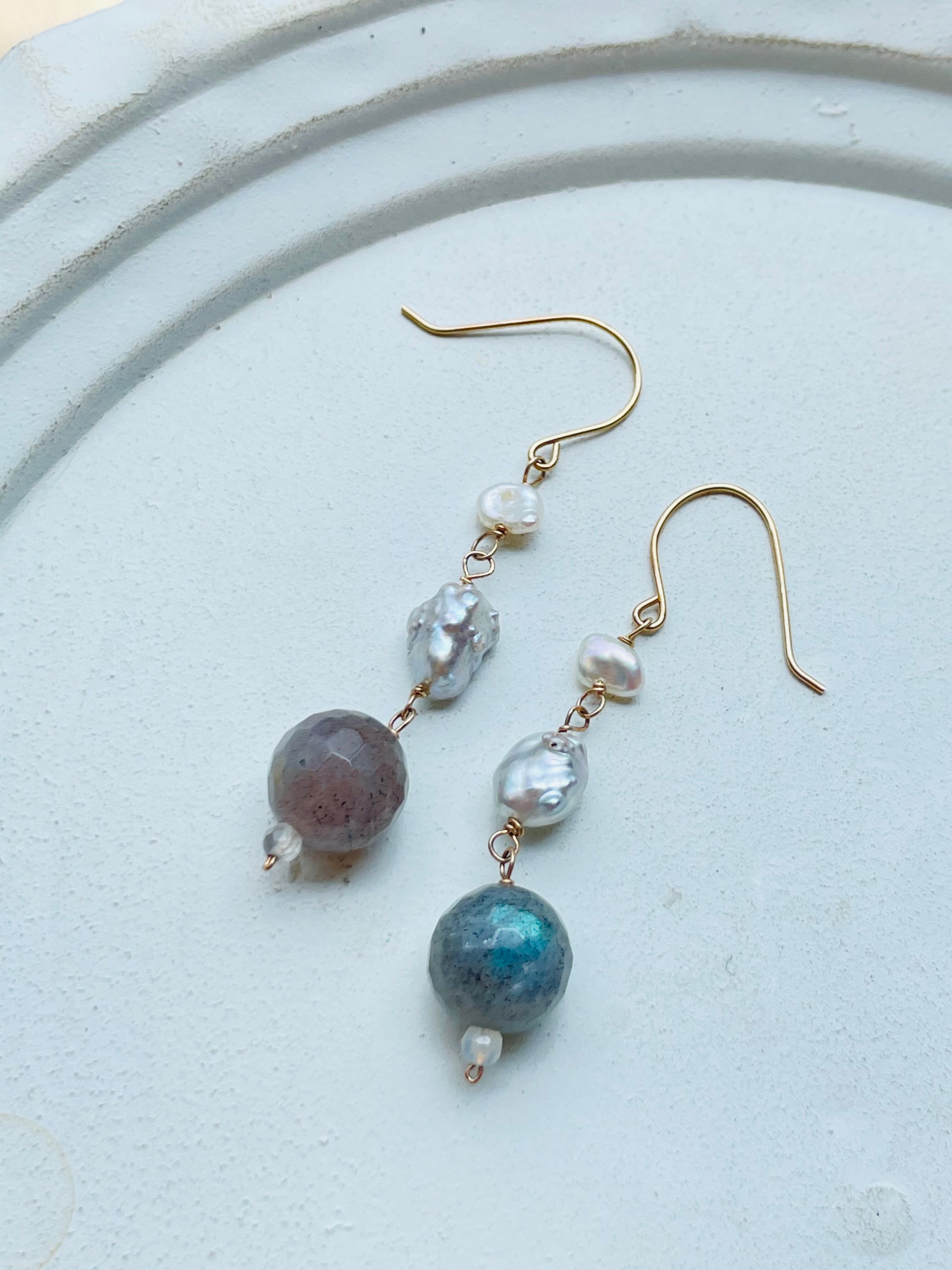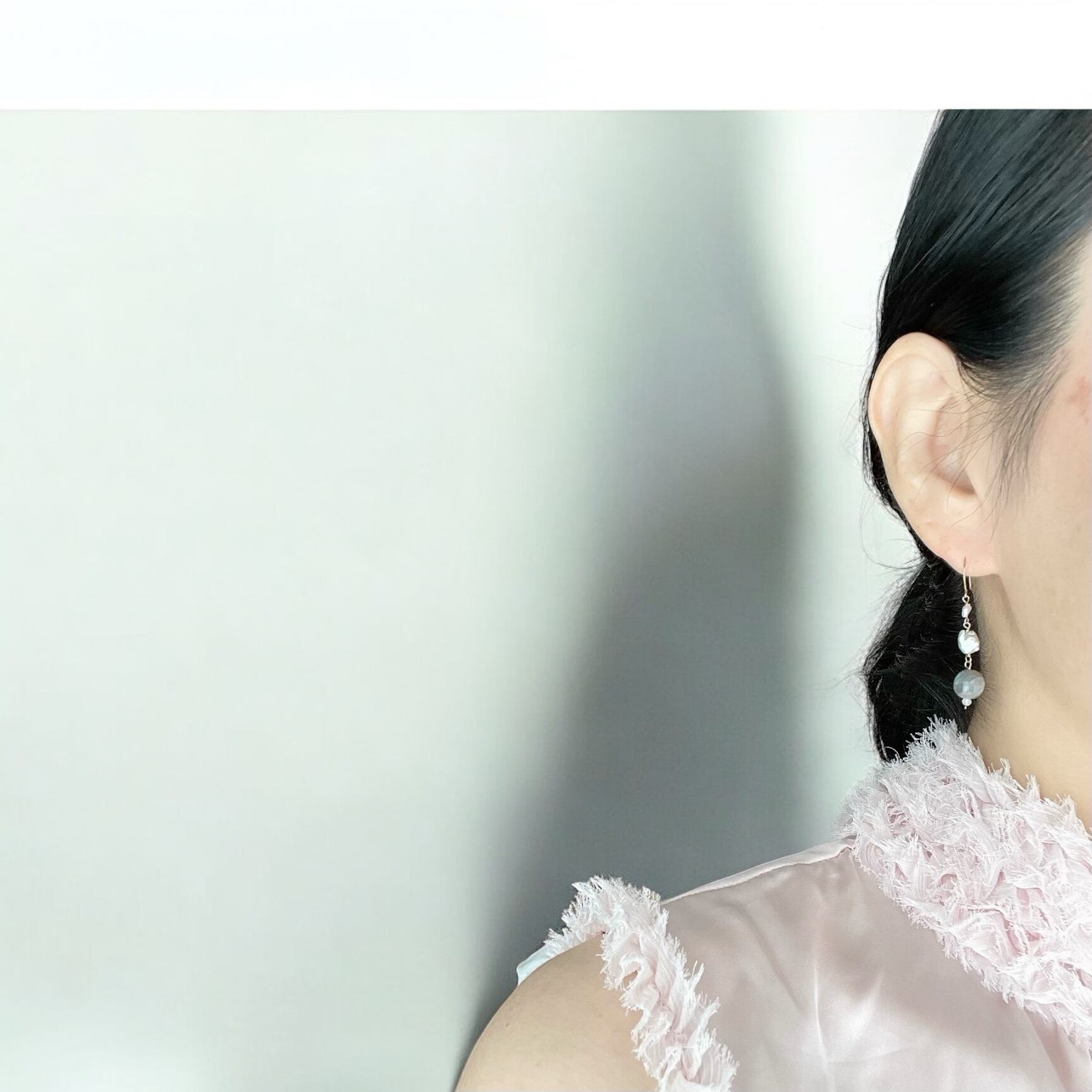キラキラとしたラブラドライトとケシパールが組み合わさったロングピアスは、どんなコーディネートにも華やかさをプラスしてくれます。シンプルな服装にも存在感をプラスし、大人のおしゃれを格上げしてくれること間違いなしです。